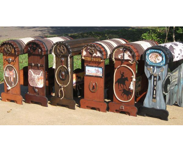 Custom designed saddle stands feature original equine and western art. These saddle stands feature original art and are decorated with repurposed horse tack, horse shoes, conchos, tassels and just about anything else that makes them look good! Each one is signed and numbered. They are proving very popular as trophies and awards at any horse event. I have designed them with different themes, such as barrel racing or roping. I have also done a few with breed themes.